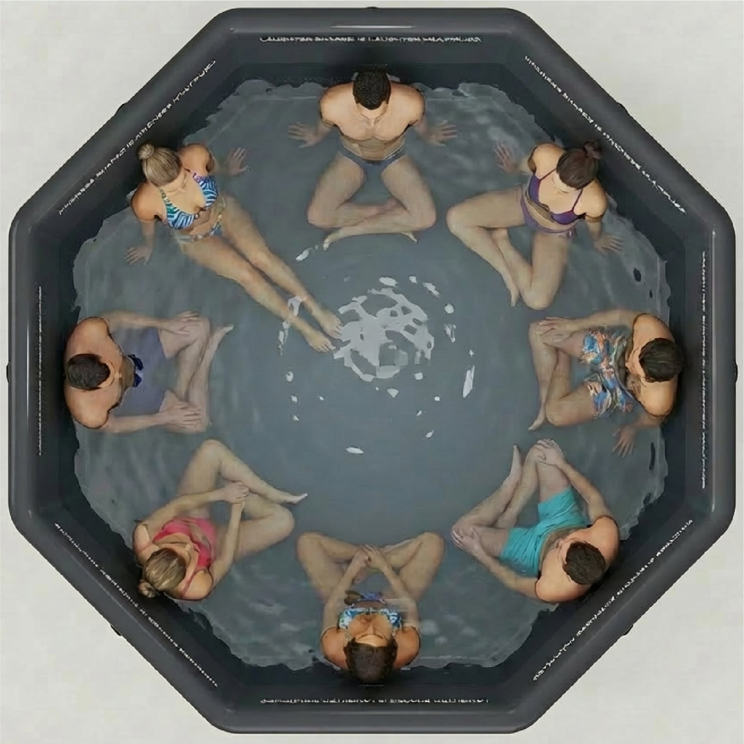Its oversized footprint accommodates 5–8 users comfortably, while the strengthened wall structure keeps the tub firm and supportive even at full capacity. The updated connection ports and simplified hose routing make setup quick and reliable in homes, gyms, studios, or outdoor events.