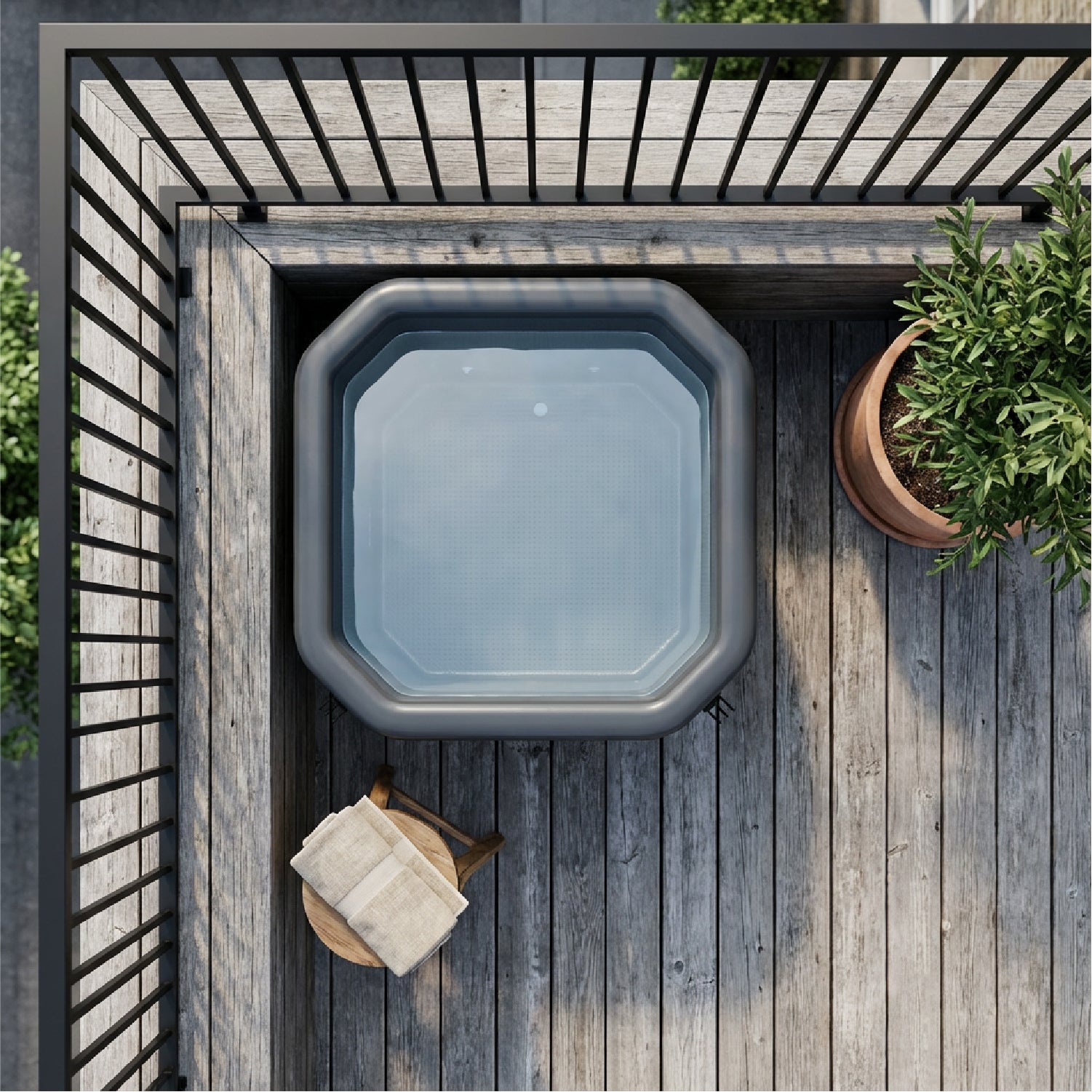 The squared barrel shape maximizes water depth while minimizing floor space, making it the perfect solution for balconies, smaller patios, or tight indoor areas.