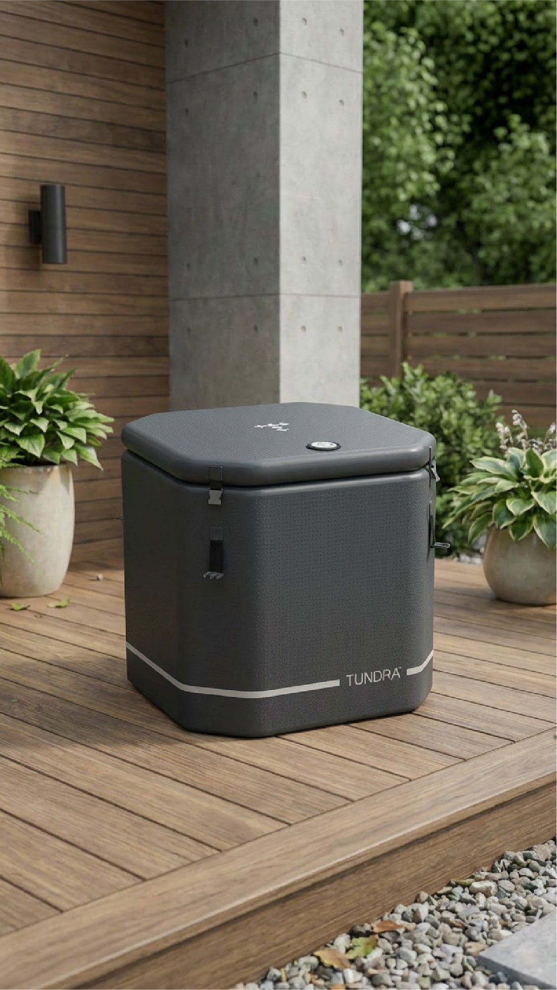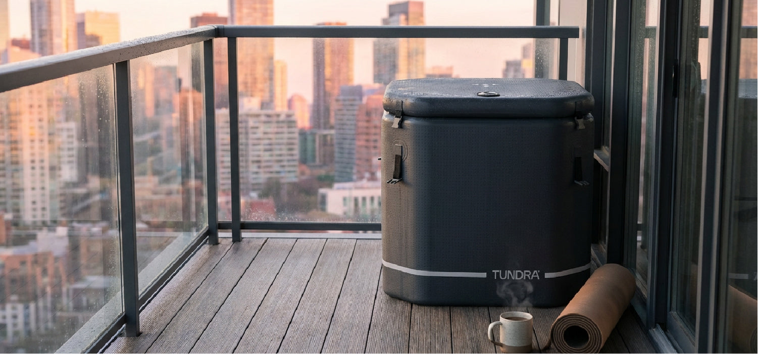 A space-saving inflatable cold plunge in a refined barrel shape paired with the Borealis™ Heater & Chiller. Durable, portable, and designed for effortless daily cold therapy — at home or outdoors.